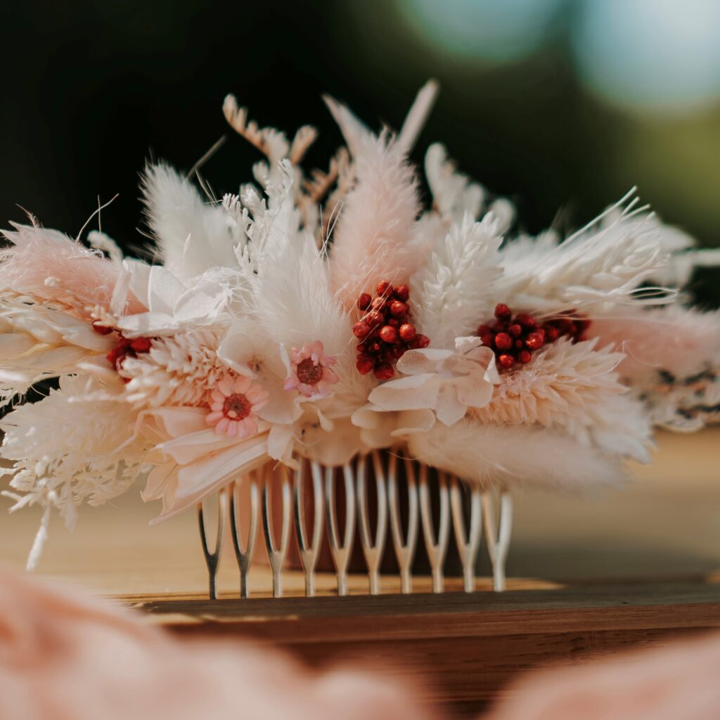 Apportez une touche de poésie à votre mariage avec des bijoux floraux délicats et élégants. Peignes, boucles d’oreilles ou bracelets…