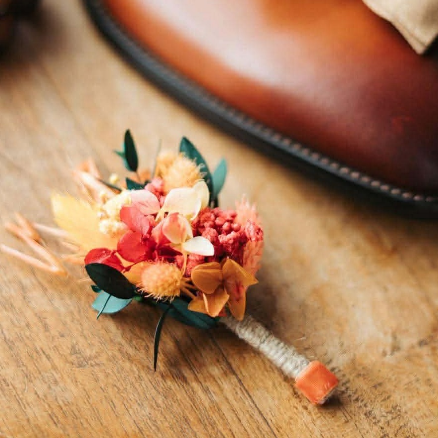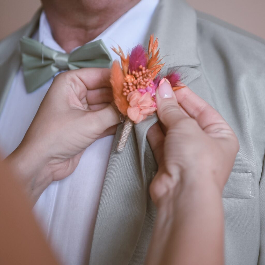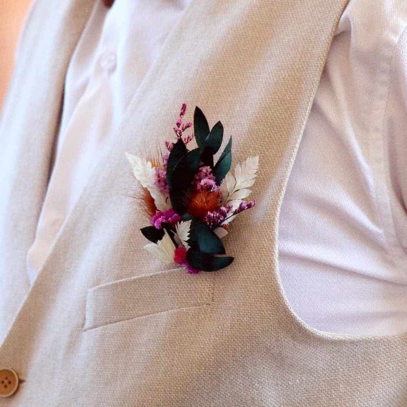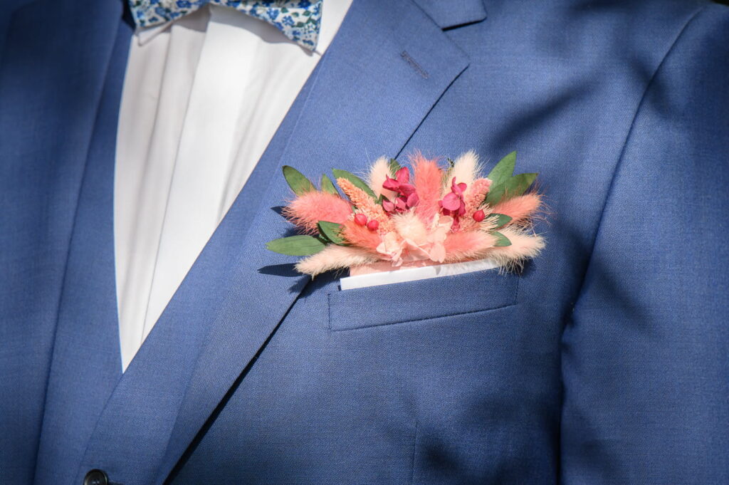 Les  boutonnières et pochettes de costume apportent une touche florale douce et naturelle aux tenues masculines.
